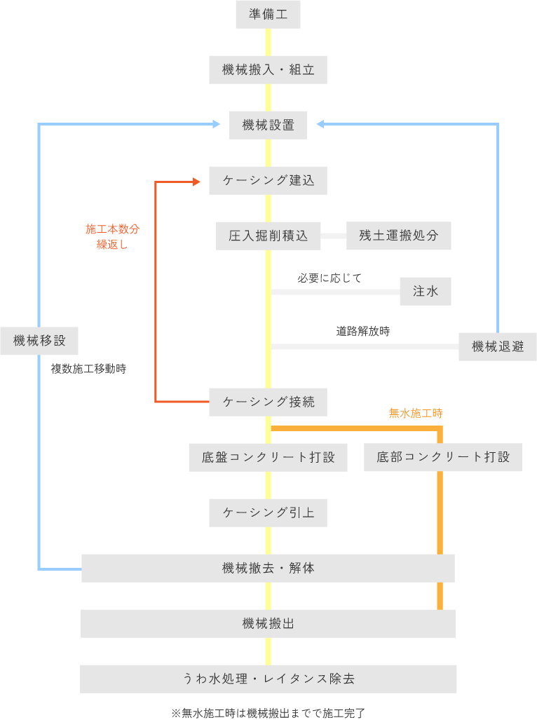 コンクリート硬化後、坑内のうわ水を処理しバキューム車を使用してレイタンスの吸引除去を行う。吸引除去したレイタンス(汚泥)は産廃処理委託業者にて処分する。無水施工の場合はレイタンス除去作業は行わない。