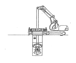 ケーシングは予め鍵穴が作成してあり、そこにワイヤーを掛けて建込作業をする。先頭ケーシングから掘削作業に応じて順に(中間、最終)仮設ケーシングと建込を行う。