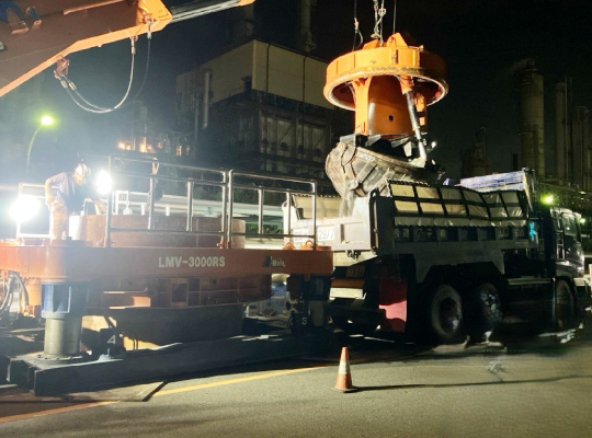 部材等をトラックに積込し、機械を撤去する。覆工板を設置したら、機械を自走させ複数施工時の場合は仮置場に移動する。それ以外の場合は機械を解体し、全周回転機と機械本体を別々にトレーラーに積込、搬出する。